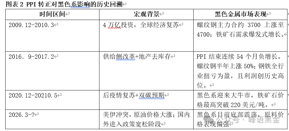 以下是历次PPI转正的宏观背景以及转正之后黑色系品种的整体表现。从中我们可以看到以下规律:PPI转正对黑色系的传导从上游到下游逐步递减,上游铁矿、焦煤价格受影响最大,其次才是成材。还有就是PPI转正过程中,黑色系的上涨往往伴随着国内政策驱动。2009、2016和2020年三轮均满足这两个特点。