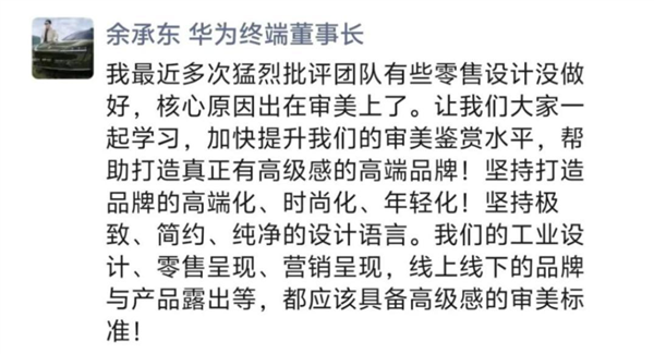 此前,余承东曾在社交平台发文,直指团队设计工作存在明显短板。