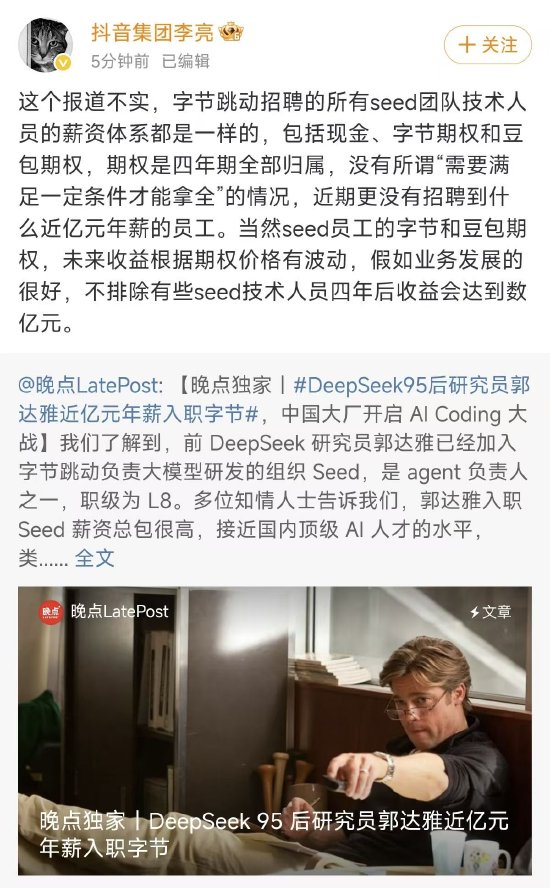 对此,今日晚间,抖音集团副总裁李亮发文称,这个报道不实,字节跳动招聘的所有seed团队技术人员的薪资体系都是一样的,包括现金、字节期权和豆包期权,期权是四年期全部归属,没有所谓“需要满足一定条件才能拿全”的情况,近期更没有招聘到什么近亿元年薪的员工。当然seed员工的字节和豆包期权,未来收益根据期权价格有波动,假如业务发展很好,不排除有些seed技术人员四年后收益会达到数亿元。